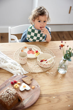 Het kinderservies set bestaat uit vier stuks: een bordje, een kommetje, een kopje en een lepel. Het serviesset is te combineren met onze andere producten uit de serie Happy Rascals. Bijvoorbeeld met de lichtgewicht slabbers of een siliconen bord.