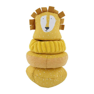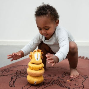 Een stoffen stapeltoren 'Wobbly Stacking Animal – Mr. Lion' van het Belgische merk Trixie. Het stapelspel bestaat uit een basis die kan tuimelen, twee stapelringen en een stoffen leeuwenhoofdje als bovenste blokje. Zacht babyspeelgoed voor de allerkleinsten.