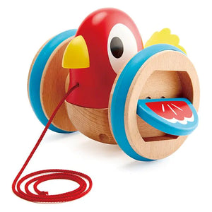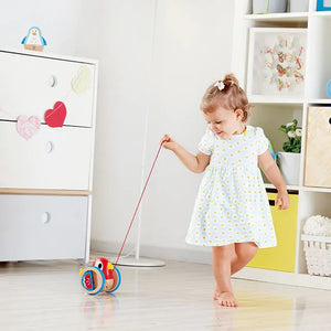 Deze babyvogel kan nog niet vliegen, maar ze vindt het heerlijk om op zichzelf te staan en kleine stappen vooruit te zetten! Gebruik het koord om aan haar mee te trekken en dan wiebelt ze en flappert met haar vleugels. De vogel heeft vrolijke kleuren.