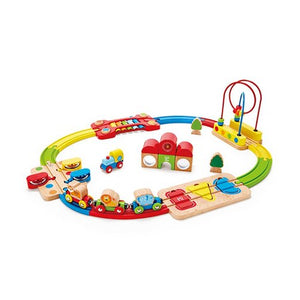 Maak speeltijd leerzaam en betoverend met onze Educatieve Regenboogspoor Puzzelset. Deze kleurrijke en veelzijdige spoorwegset combineert plezier, leren en muzikaliteit, waardoor kinderen een boeiende en stimulerende speelervaring beleven. Terwijl ze de dierentrein rond het spoor leiden, worden ze uitgedaagd om de oplossing te vinden voor het kralendoolhof en de vormendoos. Daarnaast biedt de set een Muzikale Xylofoon Rail en een vrolijke Tamboerijn Rail voor muzikale verkenning. De set wordt geleverd met een jungle-thema trein en bijpassende rijtuigen met tijger, leeuw en olifant, waardoor kinderen zich onderdompelen in de junglewereld.