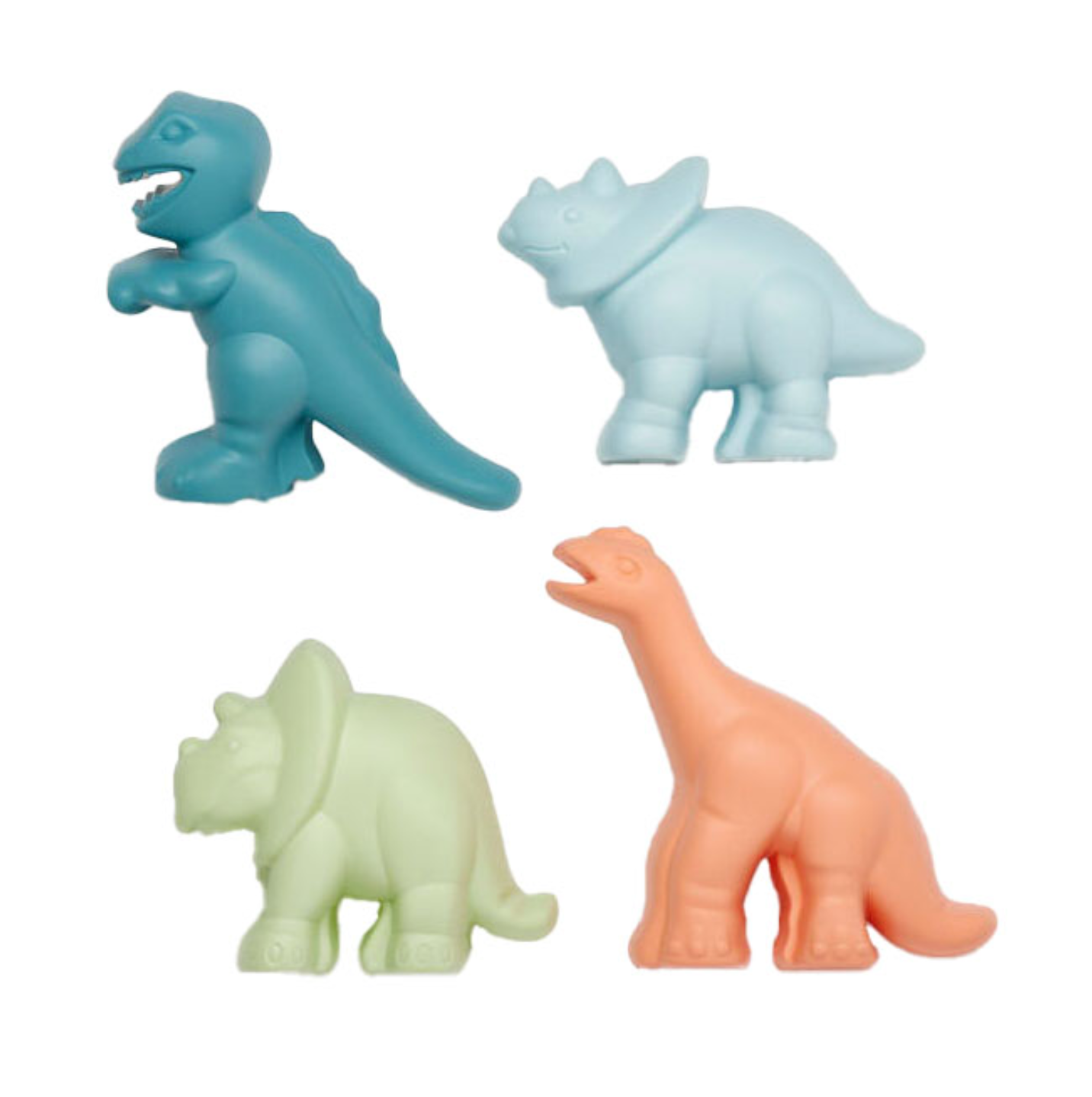 In de set zitten vier verschillende dino’s in frisse kleuren: donkerblauw, lichtblauw, groen en oranje. Je kindje kan ze vullen met zand en in één beweging een dino tevoorschijn toveren – leuk én goed voor de motoriek, fantasie en creativiteit.