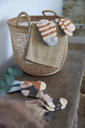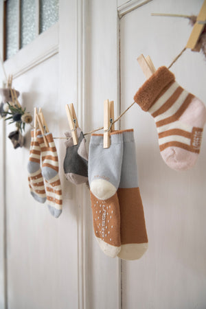 De sokken zijn verkrijgbaar in drie verschillende maten: 19-22, 23-26 en 27-30, waardoor ze perfect passen bij kindjes van verschillende leeftijden. Bovendien zijn ze verkrijgbaar in een scala aan trendy kleuren, zodat je ze moeiteloos kunt combineren met allerlei leuke outfits. Wat dacht je van antraciet/olijf, antraciet/taupe of beige/poeder roze? Of het nu gaat om een casual dag thuis of een feestje, deze sokken voegen een stijlvolle en functionele touch toe aan de garderobe van je kind. Zoek je naar veelzijdige en duurzame sokken voor je kleintje? Deze sokken zijn de ideale keuze!