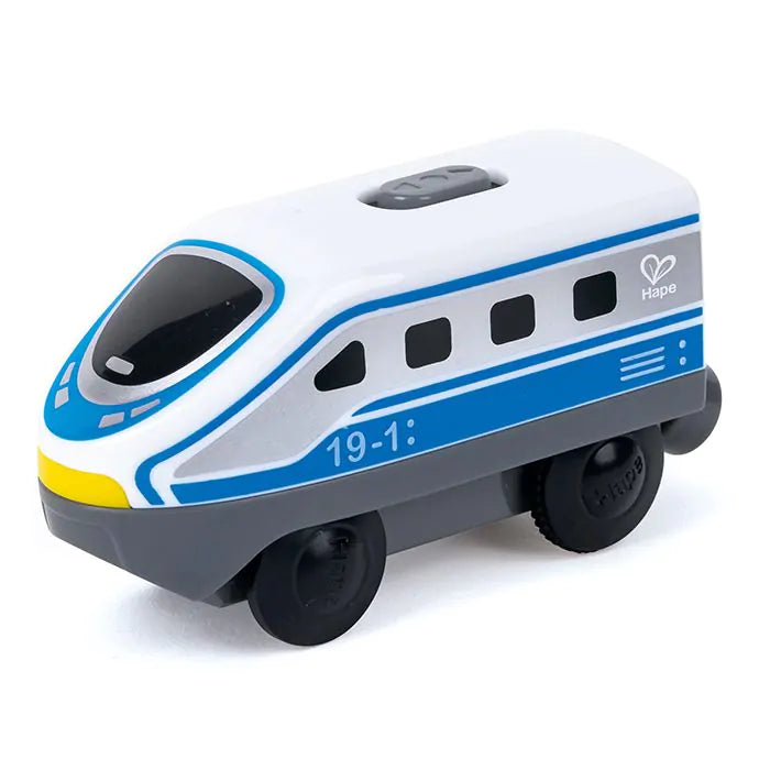 Met deze leuke blauwe houten treinlocomotief van Hape wordt het rijden eenvoudig. De op batterijen aangedreven trein rijdt eenvoudig voor- en achteruit.