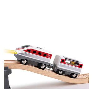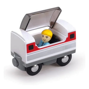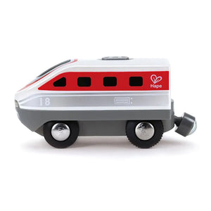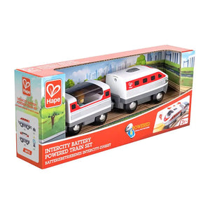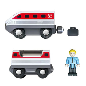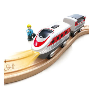 Deze mooie intercity trein van Hape bestaat uit een locomotief en wagon met passagier. De trein heeft verlichting aan de voorkant. Breng jij de passagier met zijn bagage veilig maar zijn eindbestemming?