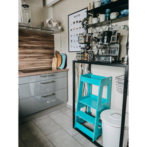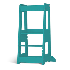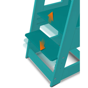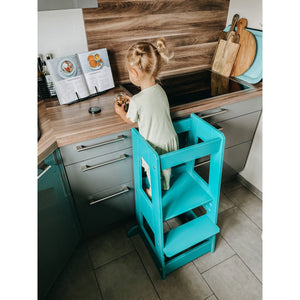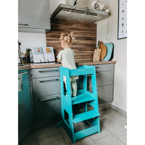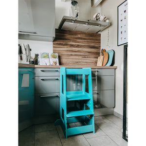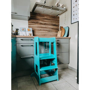 De Felix Beuken Petrol leertoren is volledig verstelbaar, wat betekent dat de toren zich aanpast aan de lengte van je kind. Dit zorgt ervoor dat de leertoren jarenlang meegaat, wat hem een duurzame keuze maakt. Of je kleintje nu net begint met helpen in de keuken of al wat ouder is, de hoogte kan eenvoudig worden aangepast zodat je kind altijd op een veilige hoogte kan staan om mee te doen.