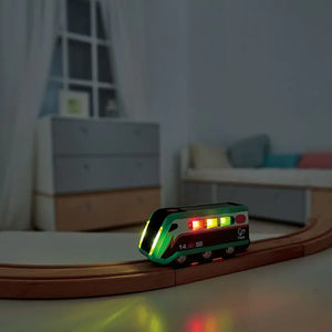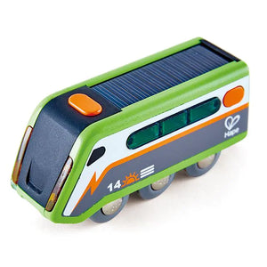 Deze slimme locomotief heeft een zonnepaneel dat voldoende elektriciteit opwekt om de eigen lichten te kunnen aansteken. Kijk naar die felle lichten wanneer je de trein over de sporen duwt! Er zitten lichten aan de voor- en binnenzijde van de locomotief. De locomotief moet met de hand worden geduwd - geen elektrische aandrijflijn. Het leert kinderen over hernieuwbare energiebronnen.