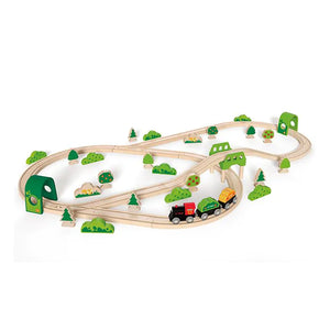 Deze bostreinset is echt een fantastisch cadeau voor kinderen! Uw kinderen kunnen een treinbaan bouwen door een wonderlijk boslandschap met bomen, tunnels, een brug en wilde dieren. Uw passagiers zullen uit de ramen willen kijken om van het mooie landschap te genieten! Deze treinbaanset combineert rechte stukken, bochten met tunnels, een brug, landschapsvormen en een trein met drie rijtuigen. Hij past bij alle houten spoorwegen. Deze speelgoedset is geschikt voor kinderen vanaf 3 jaar. Levering bevat in totaal 54 onderdelen. De brug is gemaakt met duurzaamheid in het oog en voldoet aan internationale veiligheids- en kwaliteitseisen.